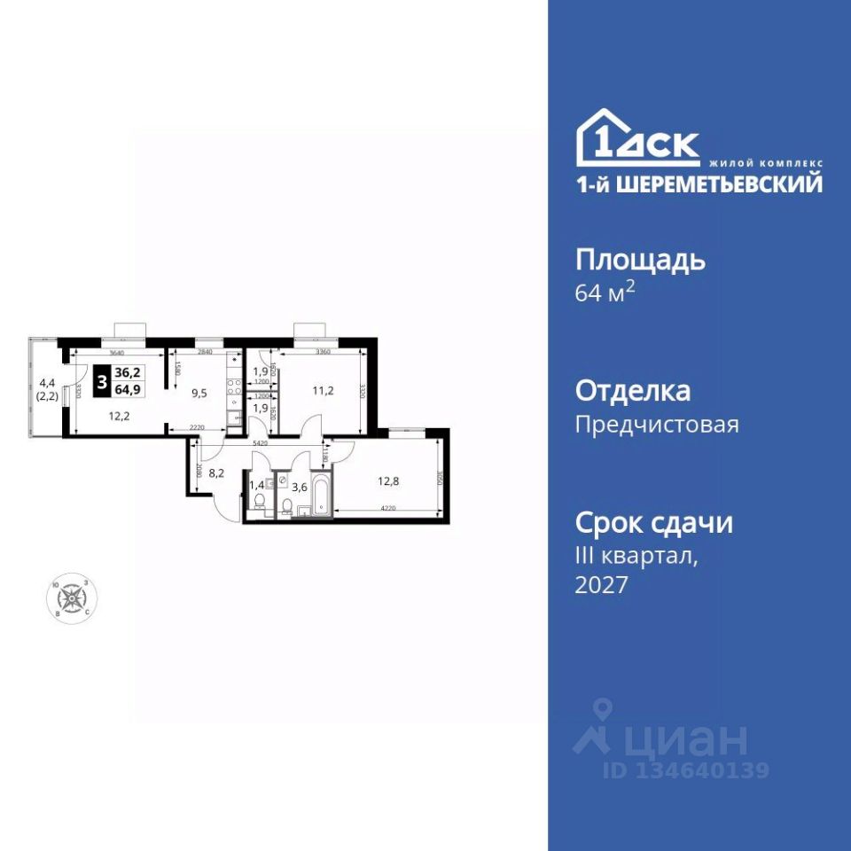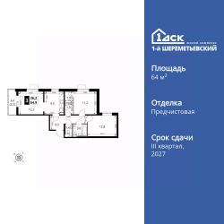 Продаётся 3-к квартира номер 1062 общей площадью 64.9 кв.м. на 16-м этаже 16 этажного здания. Отделка Whitebox. Цена с учётом скидки.