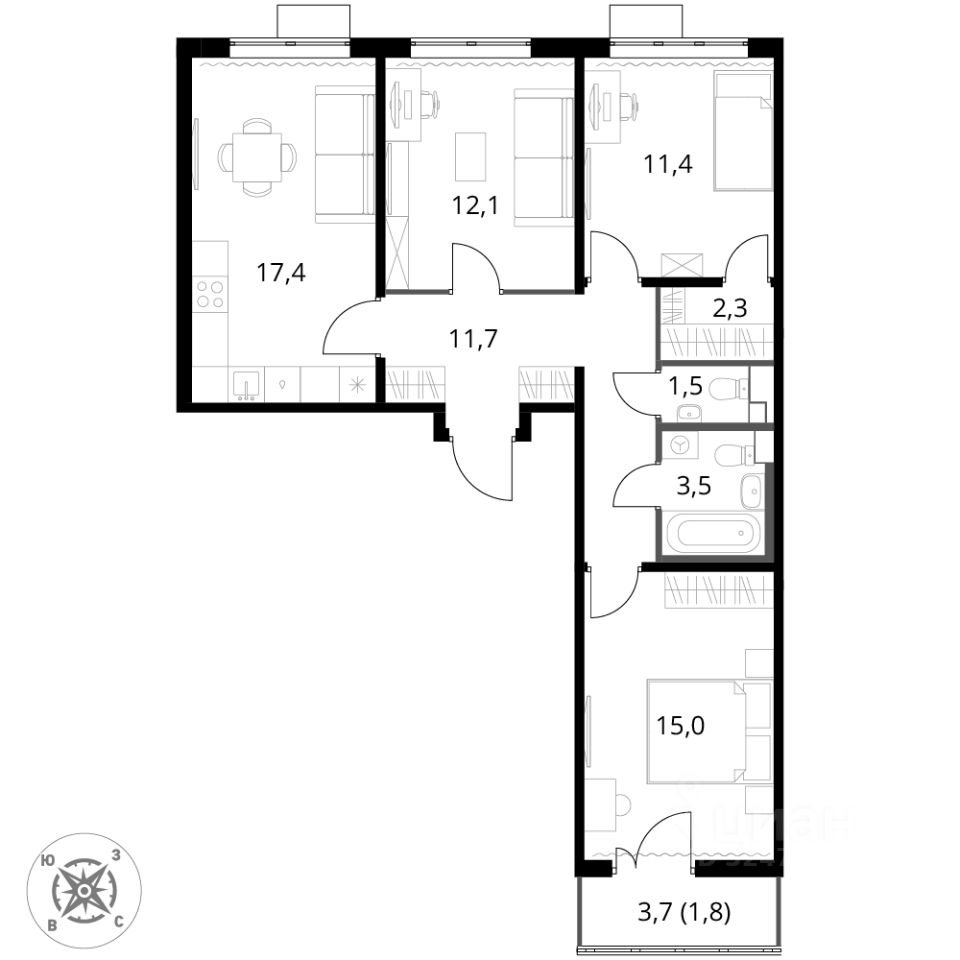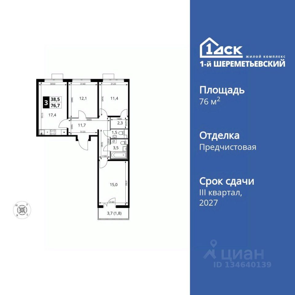 Продаётся 3-к квартира номер 1021 общей площадью 76.7 кв.м. на 11-м этаже 16 этажного здания. Отделка Whitebox. Цена с учётом скидки.