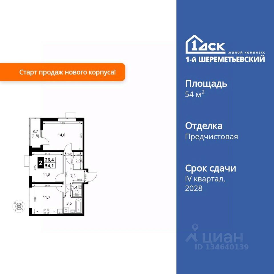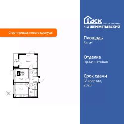 Продаётся 2-к квартира номер 3 общей площадью 54.1 кв.м. на 2-м этаже 16 этажного здания. Отделка Whitebox. Цена с учётом скидки.