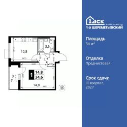 Продаётся 1-к квартира номер 142 общей площадью 34.6 кв.м. на 16-м этаже 16 этажного здания. Отделка Whitebox. Цена с учётом скидки.