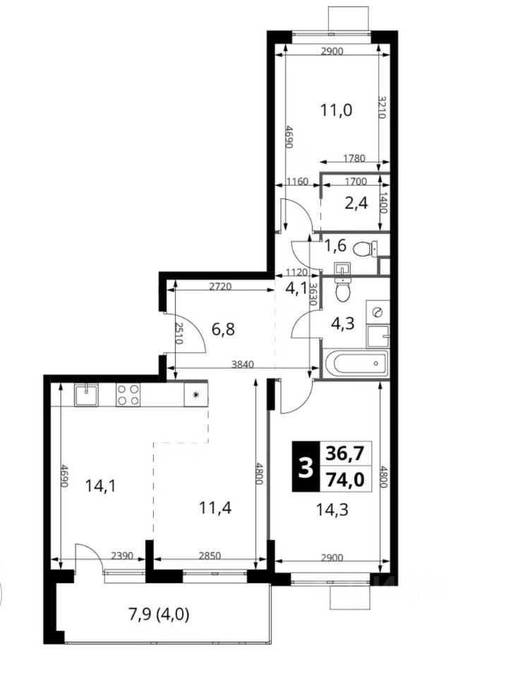 Продаётся 3-к квартира общей площадью 74кв.м. Отделка Whitebox. Цена с учётом скидки.