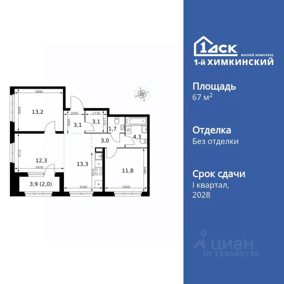 Продаётся 3-к квартира номер 2 общей площадью 67.8 кв.м. на 1-м этаже 10 этажного здания. Без отделки. Цена с учётом скидки.