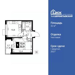 Продаётся 1-к квартира номер 961 общей площадью 32.9 кв.м. на 10-м этаже 16 этажного здания. Чистовая отделка. Цена с учётом скидки.