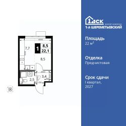 Продаётся квартира-студия номер 742 общей площадью 22.1 кв.м. на 9-м этаже 16 этажного здания. Отделка Whitebox.