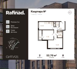 Продаётся 2-комнатная квартира общей площадью 52.70 м² на 8 этаже.