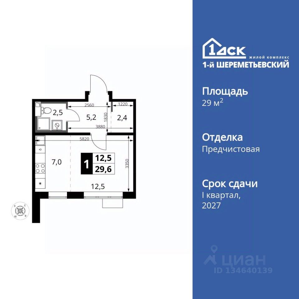 Продаётся квартира-студия номер 465 общей площадью 29.6 кв.м. на 16-м этаже 16 этажного здания. Отделка Whitebox.