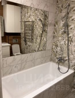 Пространство ванной комнаты разделено на зоны. Установлена ванная из литиевого мрамора размером 180*80. Подвесной унитаз. Вся сантехника фирмы Grone.