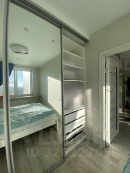Раздвижная зеркальная дверь в центре ведет в объемную гардеробную. В гардеробной обустроена зона хранения негабаритный вещей, обуви и украшений.