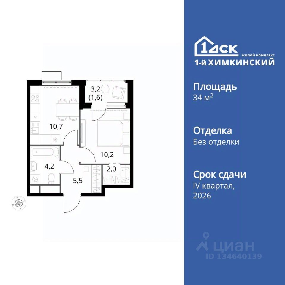 Продаётся 1-к квартира номер 463 общей площадью 34.2 кв.м. на 5-м этаже 13 этажного здания. Без отделки.