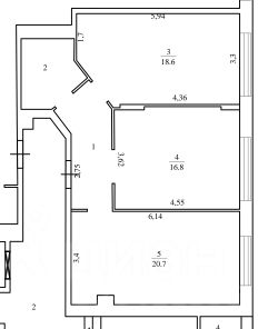 Квартира состоит из кухни-гостиной площадью 20,7 м2, и комнат 18,8 м2 и 18,6 м2.