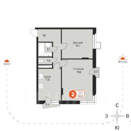 Продается двухкомнатная квартира 58,8 кв. м. Просторные комнаты 19.8 и 14.1 кв. м., большая кухня 11,5 кв. м. Панорамные окна с французскими балконами.