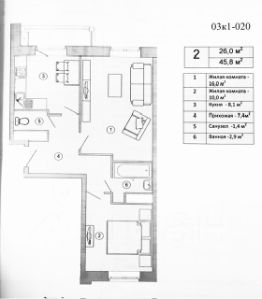 Площадь квартиры 46,4 кв. м. Две изолированные комнаты, 16 и 10 кв.м. Кухня 8,1 кв. м + балкон. Окна выходят во двор, на разные стороны. Санузел раздельный.