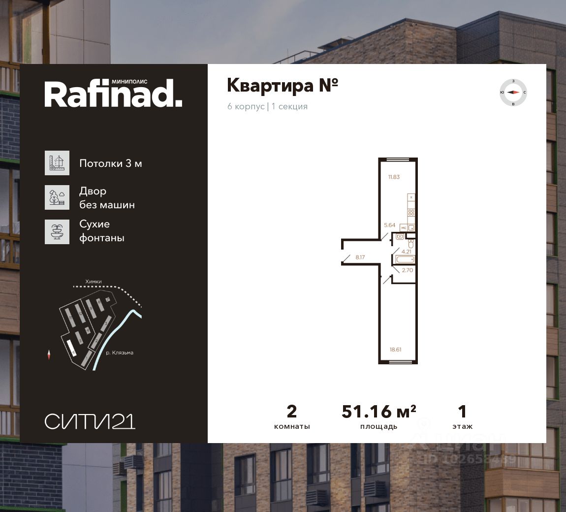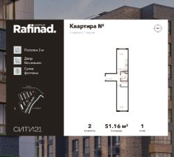 Продаётся 2-комнатная квартира общей площадью 51.16 м² на 1 этаже.