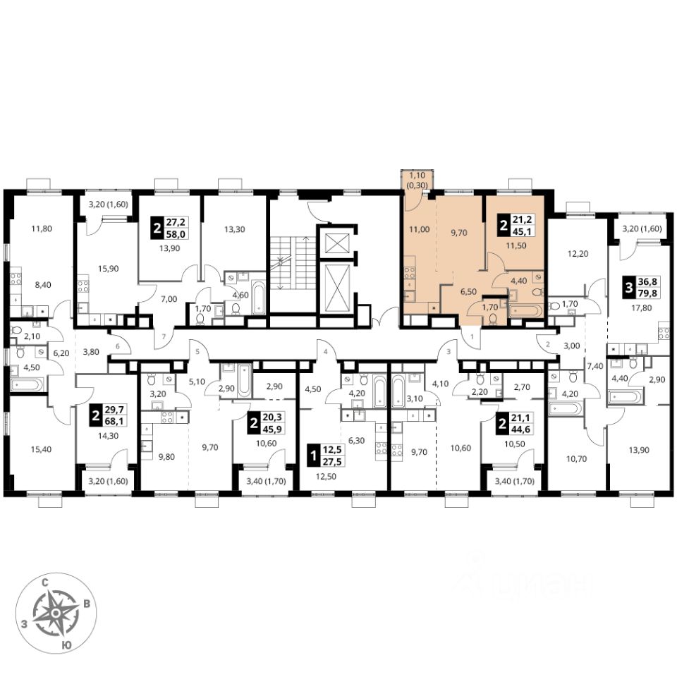 Продаётся 2-к квартира номер 147 общей площадью 45.1 кв.м. на 6-м этаже 7 этажного здания. Без отделки.
