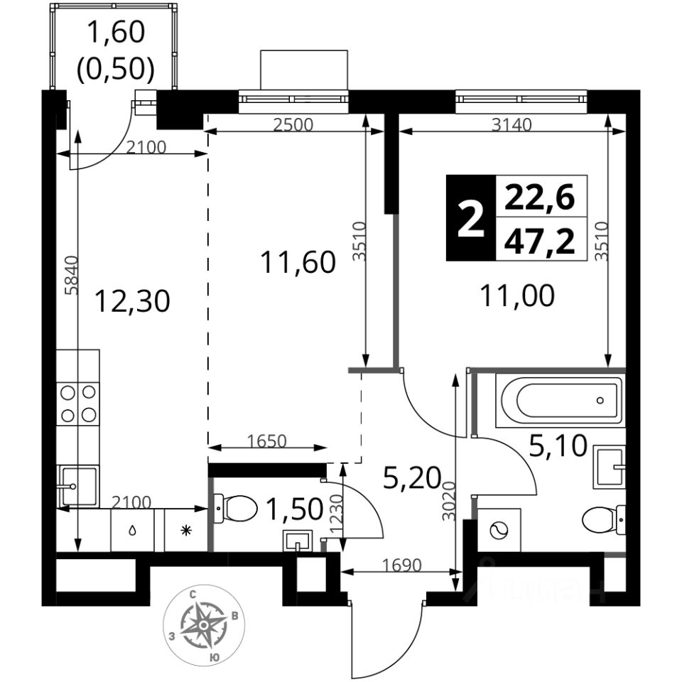 Продаётся 2-к квартира номер 299 общей площадью 47.2 кв.м. на 3-м этаже 12 этажного здания. Отделка Whitebox.