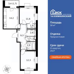 Продаётся 2-к квартира номер 555 общей площадью 58 кв.м. на 12-м этаже 13 этажного здания. Отделка Whitebox. Цена с учётом скидки.