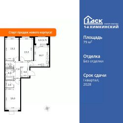 Продаётся 3-к квартира номер 258 общей площадью 79 кв.м. на 7-м этаже 8 этажного здания. Без отделки. Цена с учётом скидки.