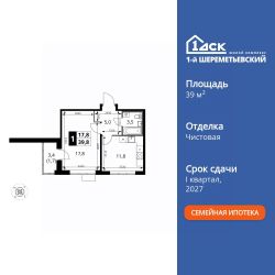 Продаётся 1-к квартира номер 948 общей площадью 39.8 кв.м. на 9-м этаже 16 этажного здания. Чистовая отделка. Цена с учётом скидки.