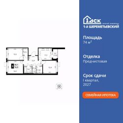 Продаётся 3-к квартира номер 403 общей площадью 74.5 кв.м. на 8-м этаже 16 этажного здания. Отделка Whitebox. Цена с учётом скидки.
