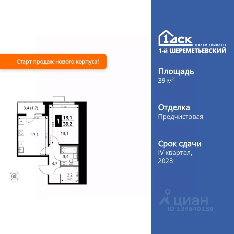 Продаётся 1-к квартира номер 192 общей площадью 39.2 кв.м. на 5-м этаже 16 этажного здания. Отделка Whitebox. Цена с учётом скидки.