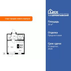 Продаётся квартира-студия номер 379 общей площадью 30.1 кв.м. на 11-м этаже 16 этажного здания. Отделка Whitebox. Цена с учётом скидки.