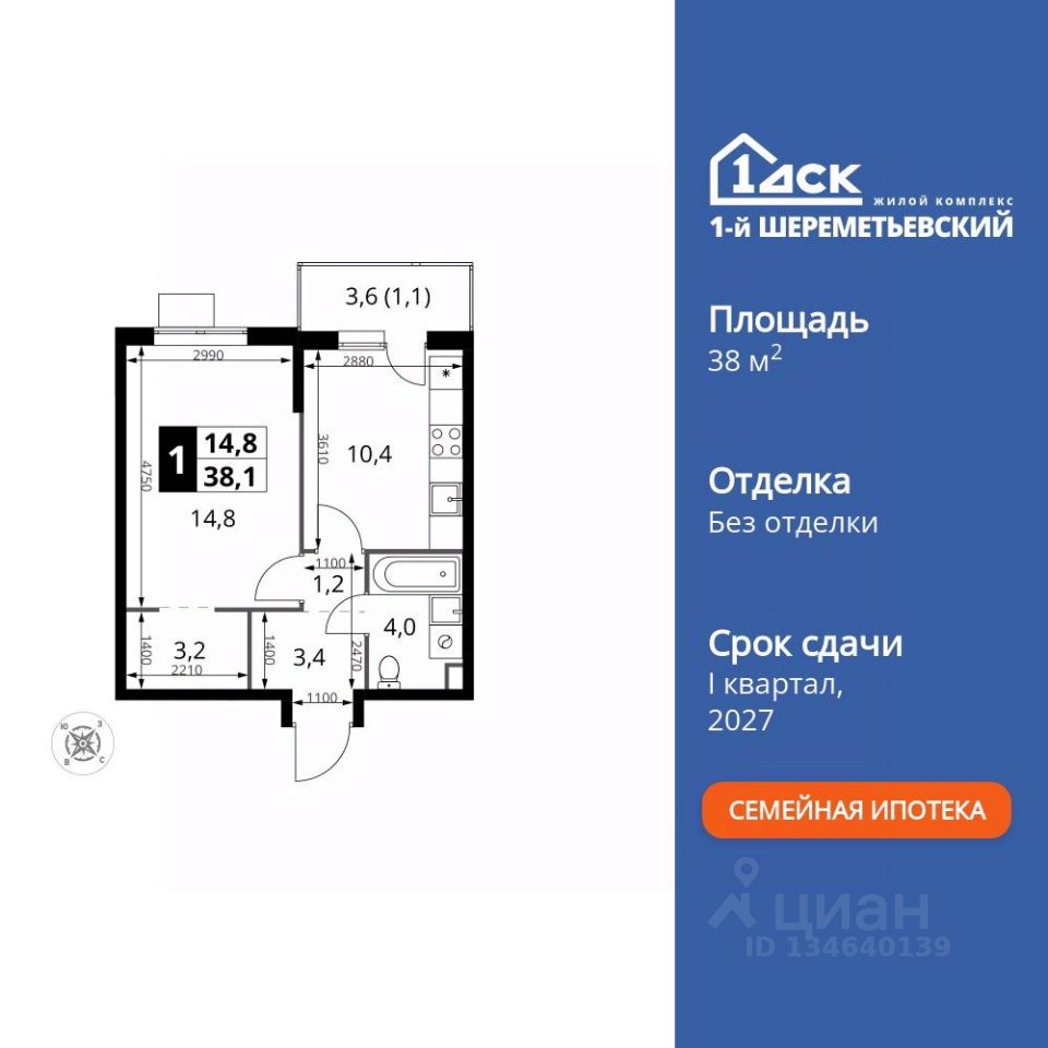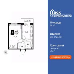 Продаётся 1-к квартира номер 821 общей площадью 38.1 кв.м. на 15-м этаже 17 этажного здания. Без отделки.
