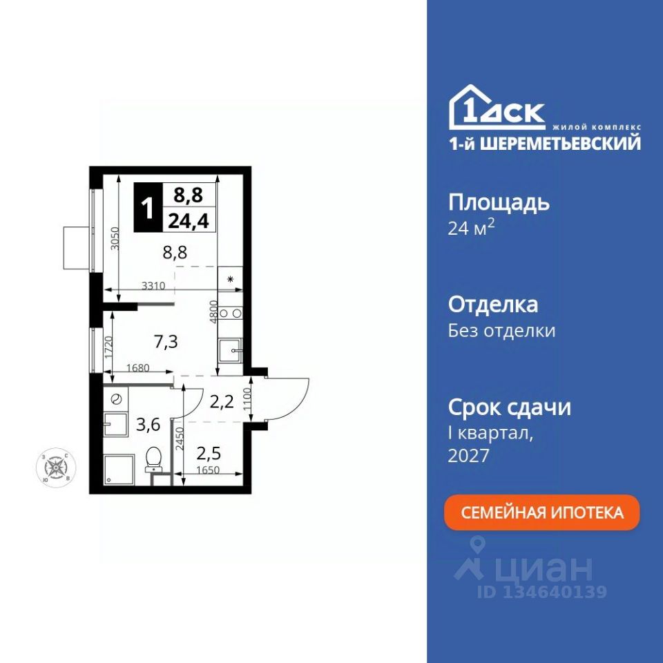 Продаётся квартира-студия номер 957 общей площадью 24.4 кв.м. на 10-м этаже 11 этажного здания. Без отделки.