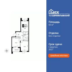 Продаётся 2-к квартира номер 185 общей площадью 60.4 кв.м. на 6-м этаже 16 этажного здания. Без отделки.