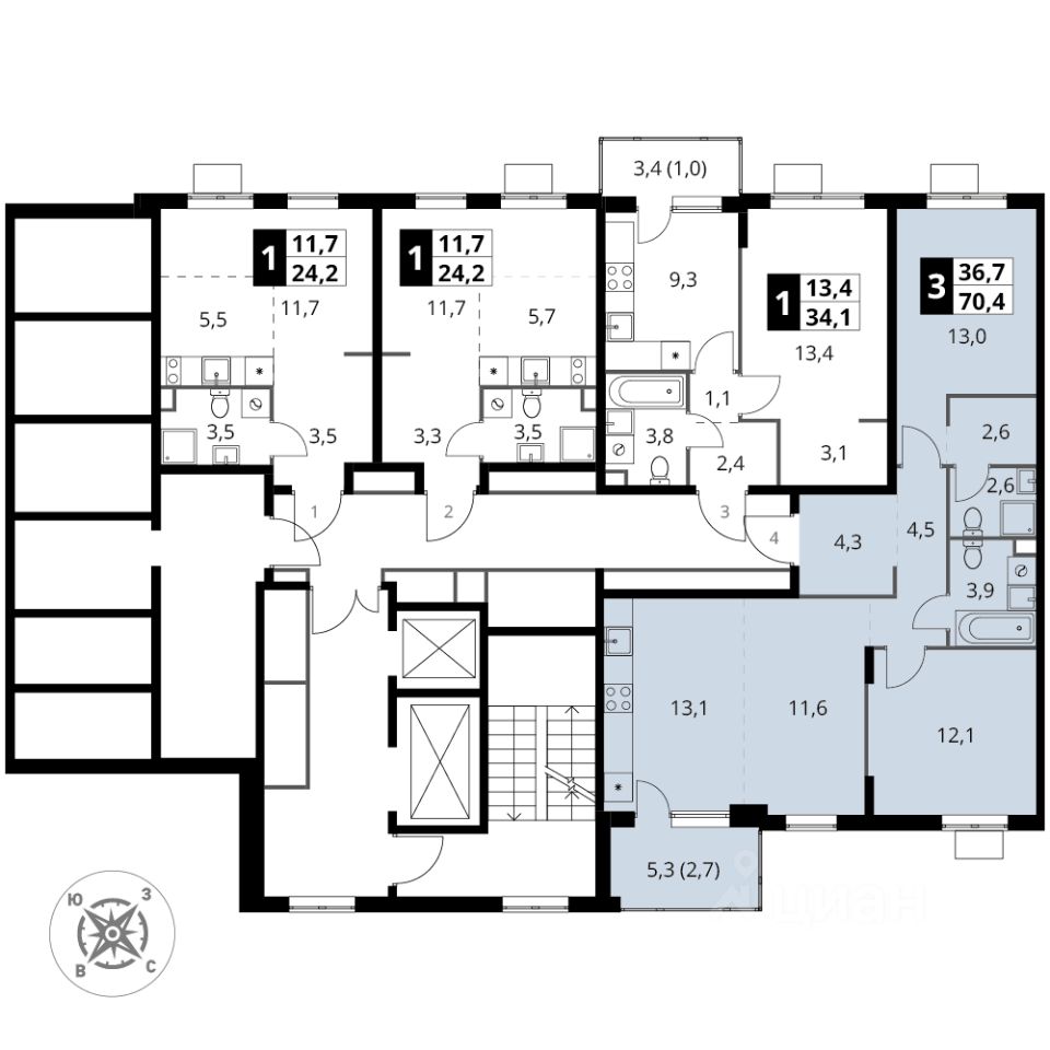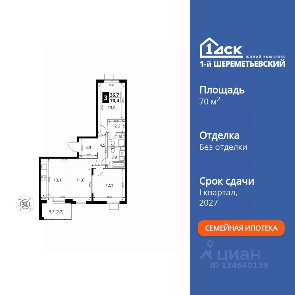 Продаётся 3-к квартира номер 693 общей площадью 70.4 кв.м. на 2-м этаже 17 этажного здания. Без отделки.