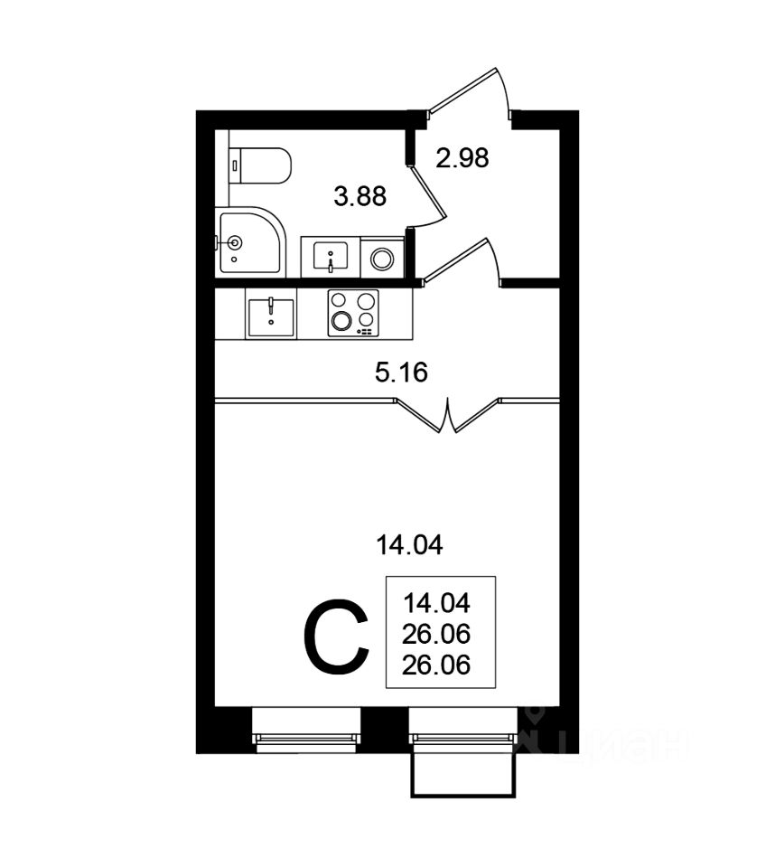Продаётся студия в строящемся доме (Корпус 6), срок сдачи: 2-кв. 2026, общей площадью 26.06 кв.м., на 5 этаже.