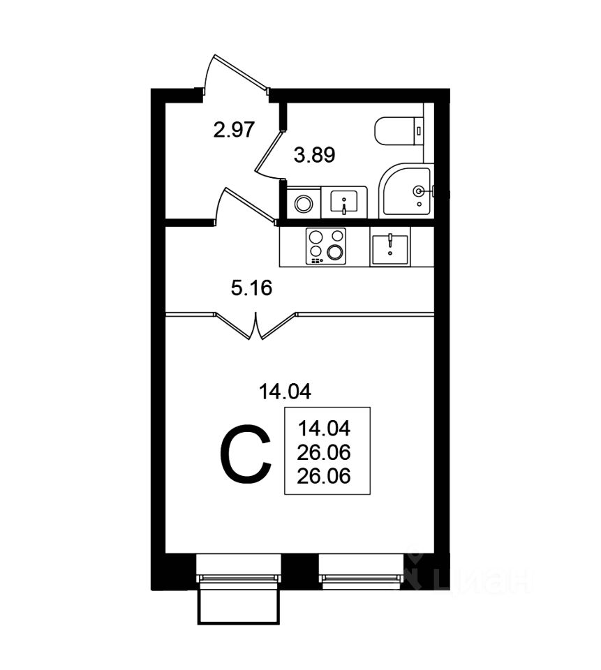 Продаётся студия в строящемся доме (Корпус 8), срок сдачи: 1-кв. 2026, общей площадью 26.06 кв.м., на 5 этаже.