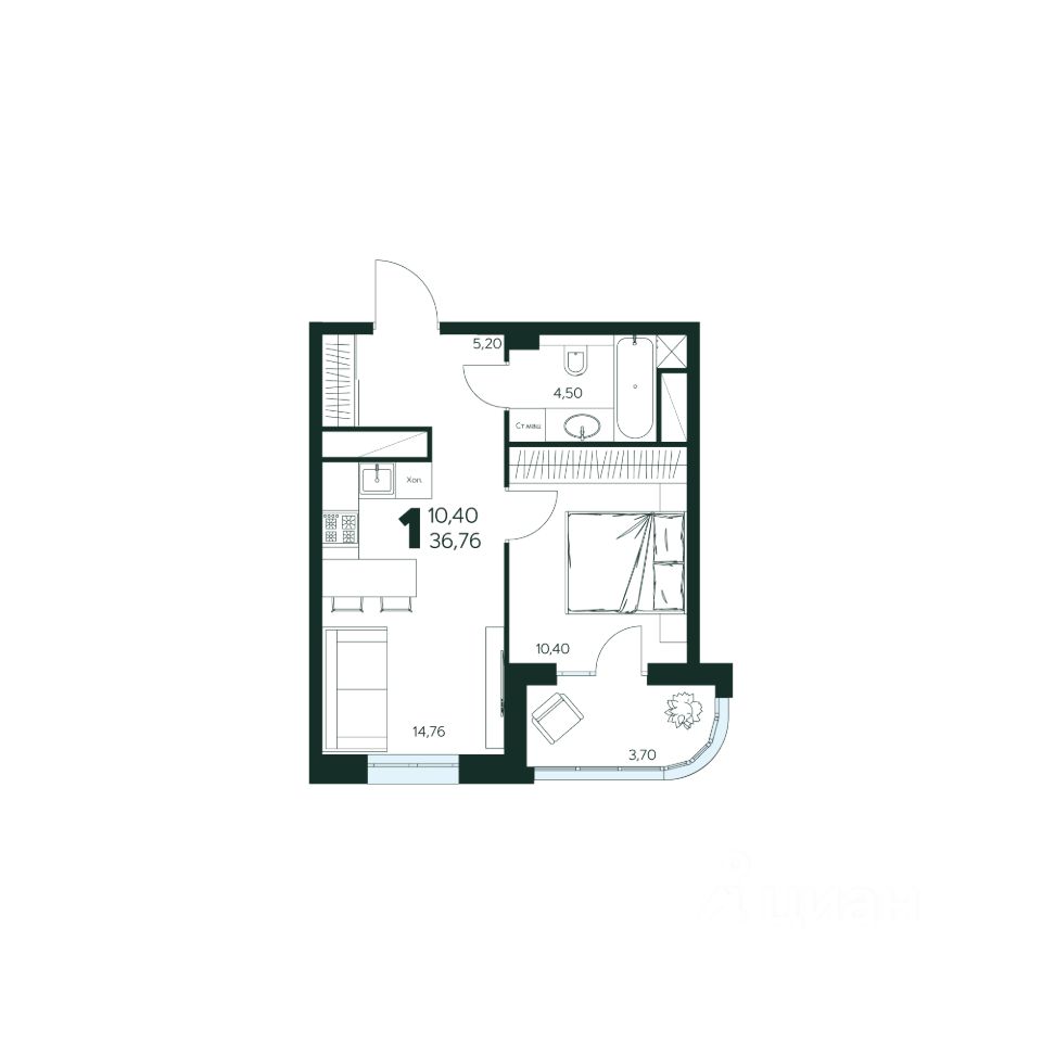 1-комн. квартира, 36,76 м²