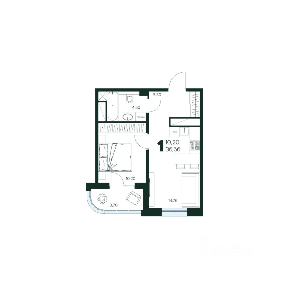 1-комн. квартира, 36,66 м²