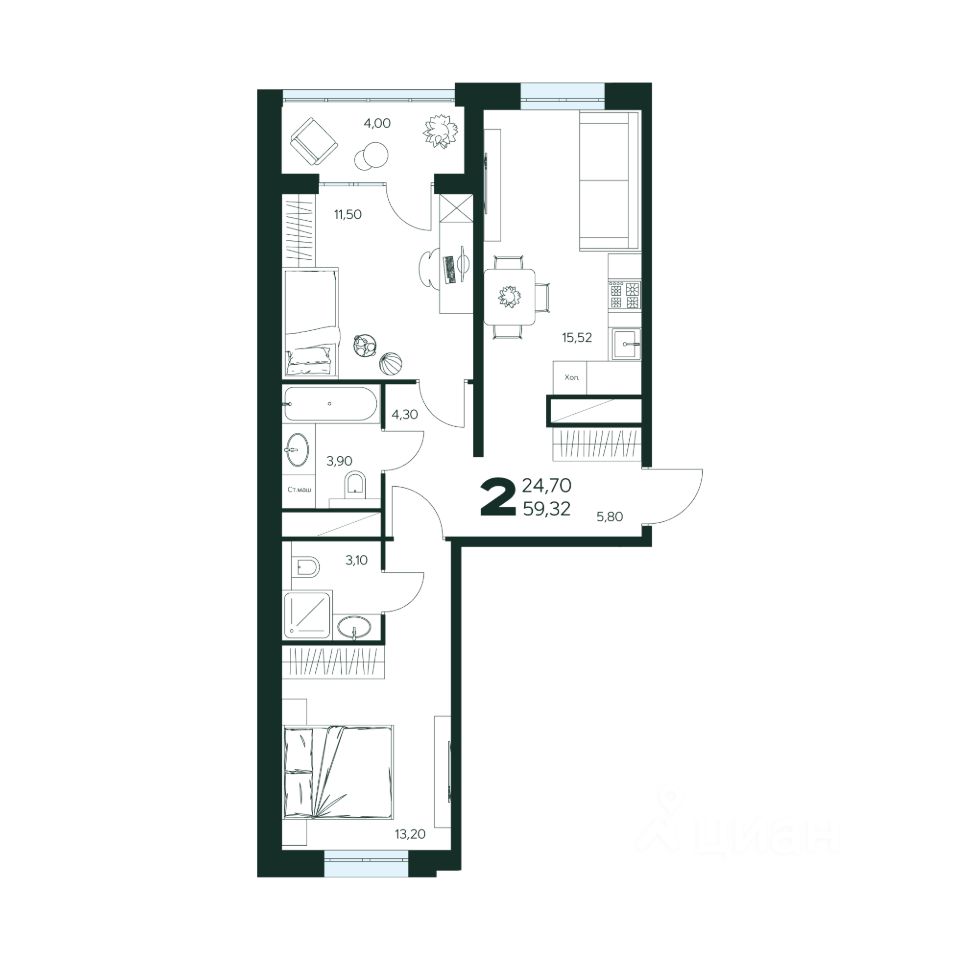 2-комн. квартира, 59,32 м²