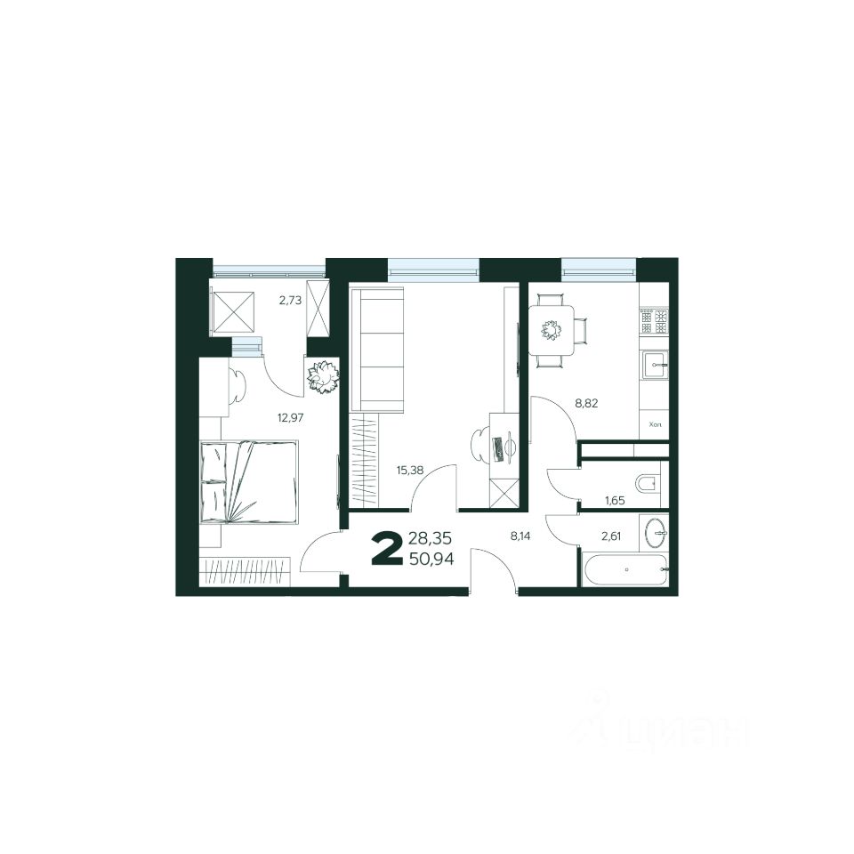 2-комн. квартира, 50,94 м²