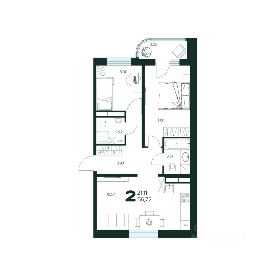 Продаётся 2-комнатная квартира в строящемся доме (Корпус 2), срок сдачи: III-кв. 2027, общей площадью 56.72 кв.м., на 2 этаже. Новый жилой комплекс "по ул. Первомайская"