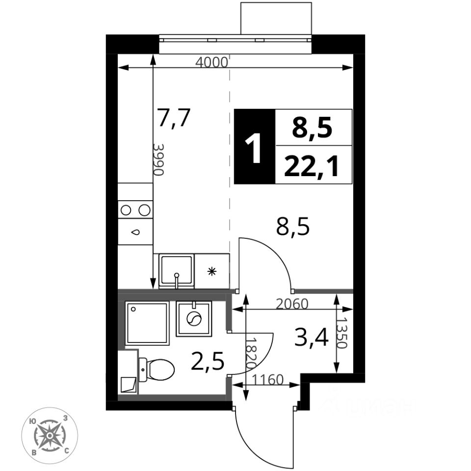Продаётся квартира-студия номер 833 общей площадью 22.1 кв.м. на 12-м этаже 16 этажного здания. Отделка Whitebox.