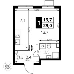 Продаётся квартира-студия номер 65 общей площадью 29 кв.м. на 12-м этаже 16 этажного здания. Без отделки.