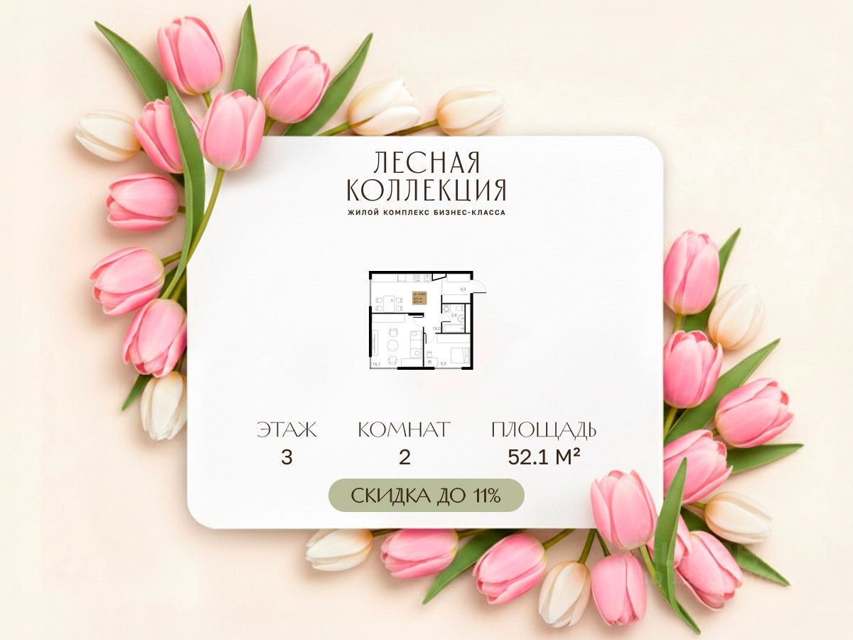 Выгода до 11%. Продажа напрямую от застройщика в жилом комплексе Лесная Коллекция! 2-комнатная квартира на 3-этаже, площадью 52.1-квм.