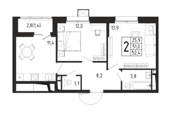 Продаётся 2-комнатная квартира в строящемся доме (Корпус 4 (2 очередь)), общей площадью 52.40 кв.м., на 3 этаже.
