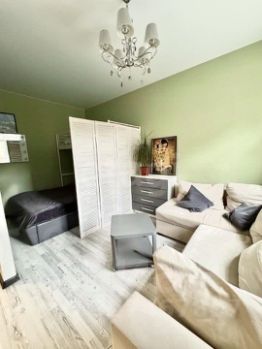 Общая площадь 29.9 кв. м, этаж 5. Удобная планировка: просторная гардеробная при входе позволяет хранить вещи и не загромождать комнату, разграничены зона отдыха, спальная зона и кухня, санузел совмещенный. Окна выходят в тихий двор.