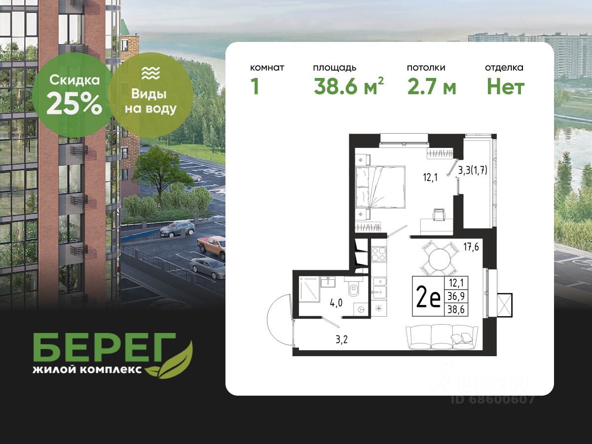 Продаётся 1-комнатная квартира в строящемся доме (Корпус 4 (2 очередь)), общей площадью 38.60 кв.м., на 4 этаже.
