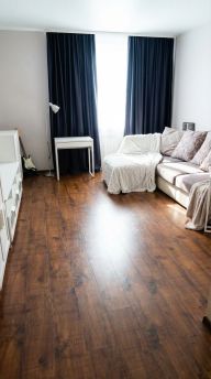 Квартира с ремонтом; стены выровнены, покрашены - легко перекрасить в любой момент. В комнатах качественный ламинат на полу, без дефектов; в коридоре и на кухне - плитка. В туалете месяц назад сделан ремонт - новый унитаз, плитка. Ванная комната в плитке.
