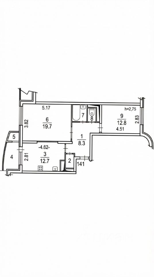 Площадь комнат: 19,7 и 12,8 кв. м.