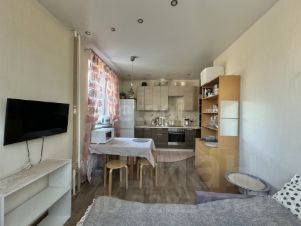 Кухня-гостиная особенно светлая и воздушная благодаря двум окнам, выходящим на разные стороны, и светлой мебели. Здесь приятно жить, отдыхать и проводить время с близкими в небольшой компании. Есть большой раскладной диван, стол, журнальный столик, комод с полками и компактная кухня со всем необходимым: варочная панель, духовой шкаф и микроволновая печь, холодильник. В спальне стоит большая двухспальная кровать и шкаф. Много места для хранения.