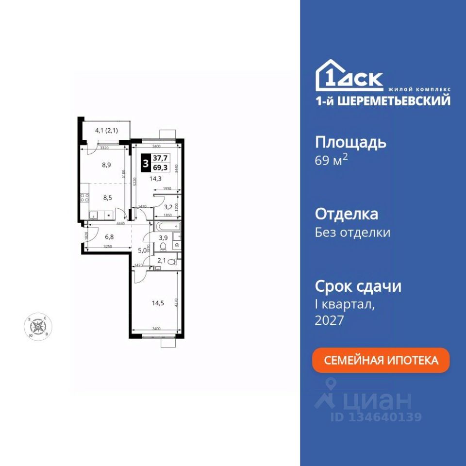 Продаётся 3-к квартира номер 1222 общей площадью 69.3 кв.м. на 6-м этаже 17 этажного здания. Без отделки.