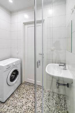 • Санузел — плитка на стенах и полу, установлена сантехника