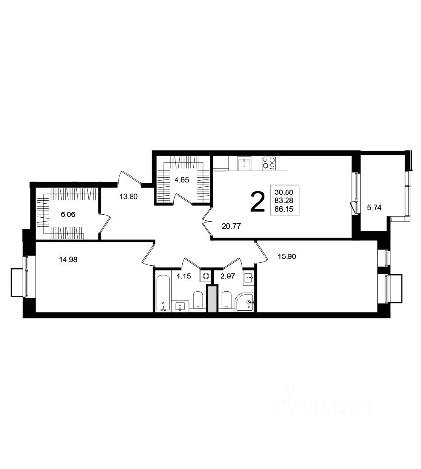 Продаётся 2-комнатная квартира в строящемся доме (Корпус 7), срок сдачи: 2-кв. 2026, общей площадью 86.15 кв.м., на 2 этаже.