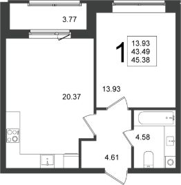 Продаётся 1-комнатная квартира в строящемся доме (Корпус 5), срок сдачи: 2-кв. 2026, общей площадью 45.38 кв.м., на 1 этаже.