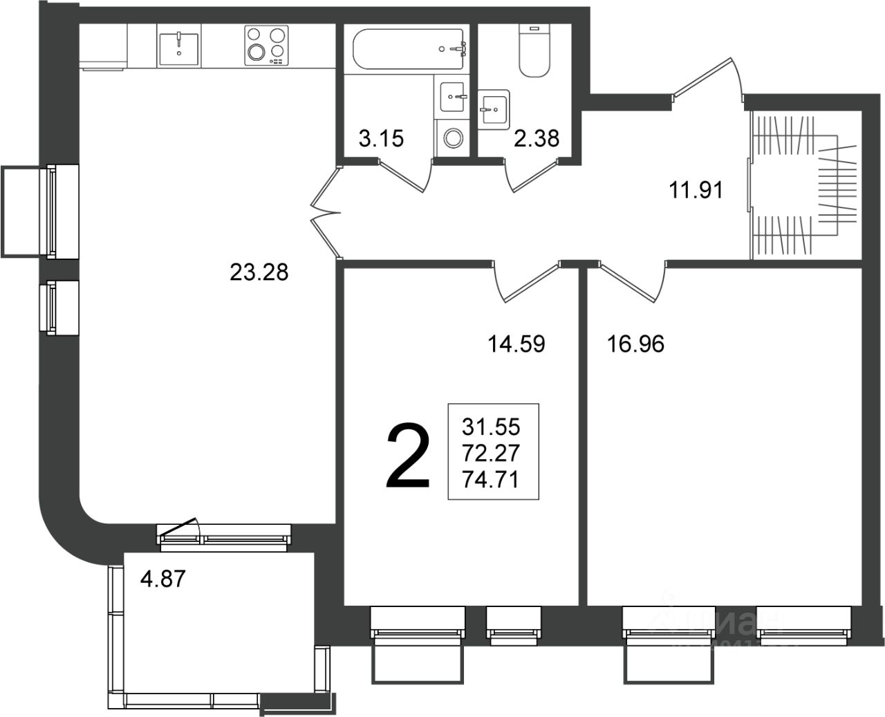 Продаётся 2-комнатная квартира в строящемся доме (Корпус 5), срок сдачи: 2-кв. 2026, общей площадью 74.71 кв.м., на 2 этаже.